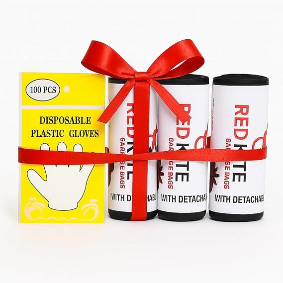 • COMPLETE SET: Pack of 3 Red Kite garbage bag rolls bundled with 100 disposable gloves, perfect for convenient waste garbage disposal bags and hygienic trash handling.